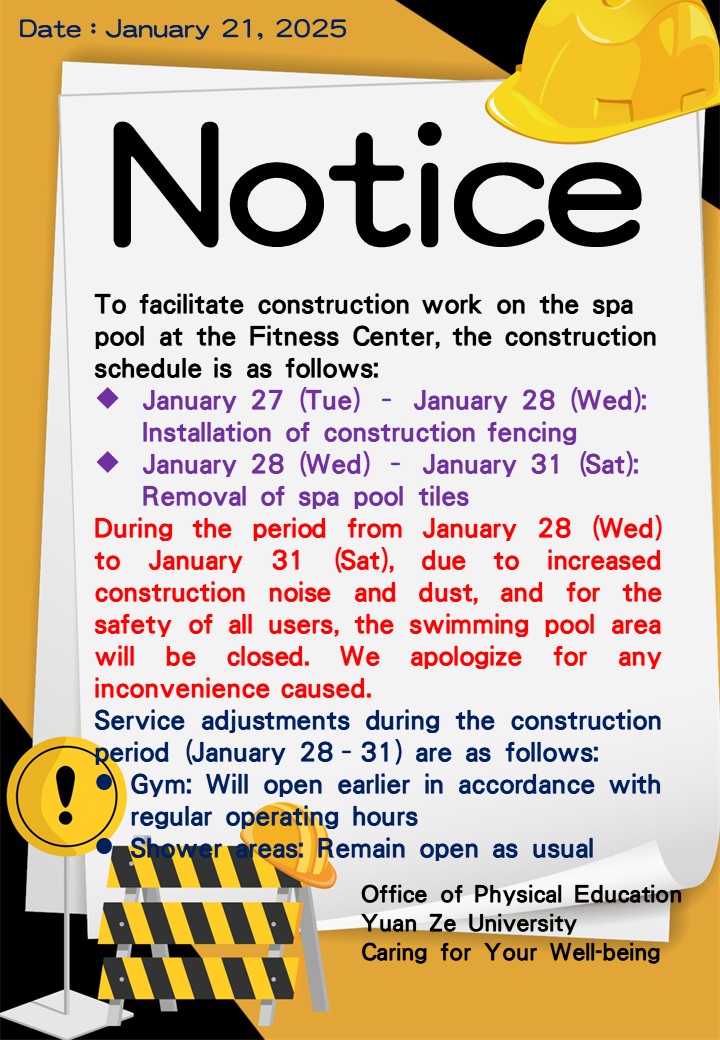 | Fitness Center Spa Pool Construction Notice | 2026-01-22 09:20:52 |