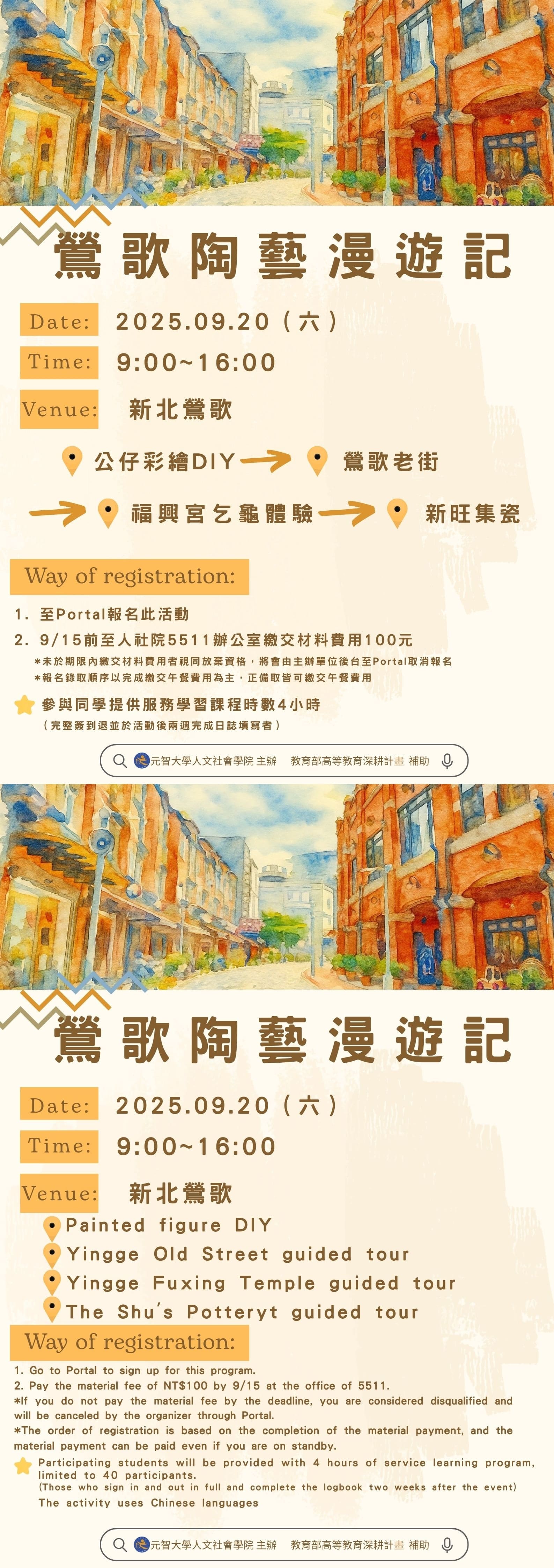帶領同學透過觀察鶯歌老街的歷史建築與產業轉型,了解地方文化與生活產業的關聯,進一步培養在地關懷與文化認同感,實踐跨領域整合與主動學習的精神,並進行彩繪公仔DIY。