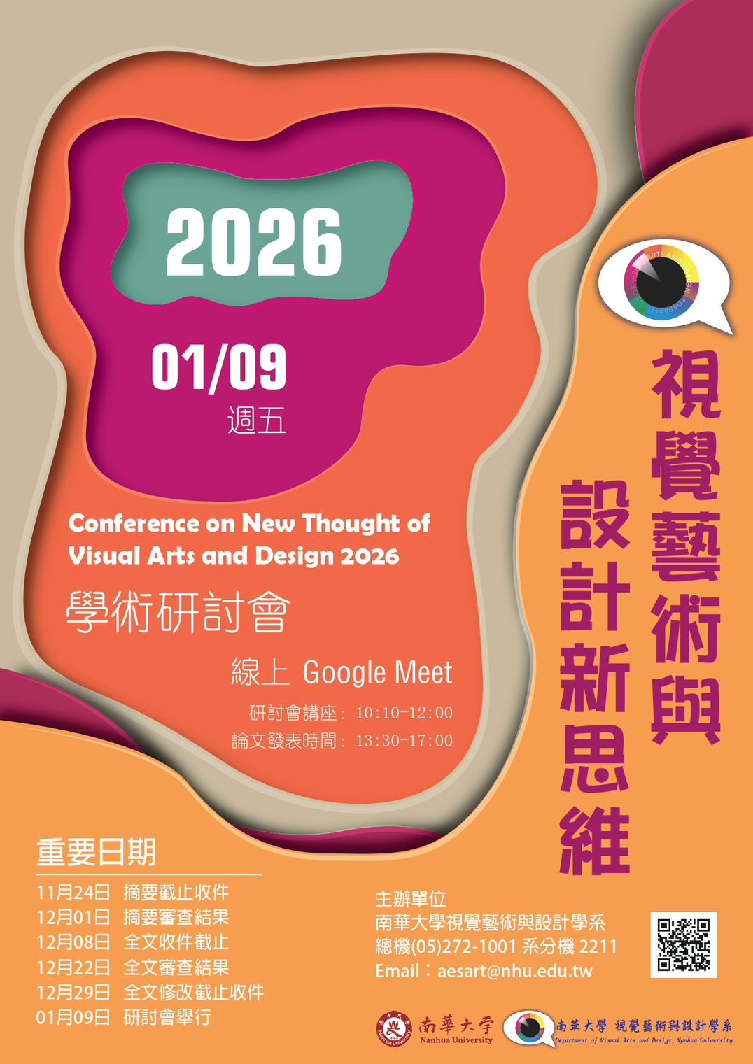 五、研討會徵稿文件、活動內容、論文審查結果等,請逕至視覺藝術與設計學系網站下載或查詢,網址:https://visual3.nhu.edu.tw。