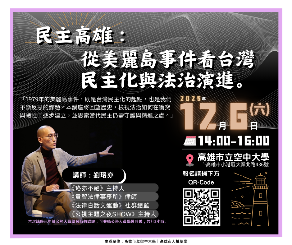 主旨:敬請貴單位協助公告本校人權學堂12月份辦理之「民主高雄:從美麗島事件看台灣民主化與法治演進」講座訊息,並鼓勵同仁踴躍參加,請查照。
