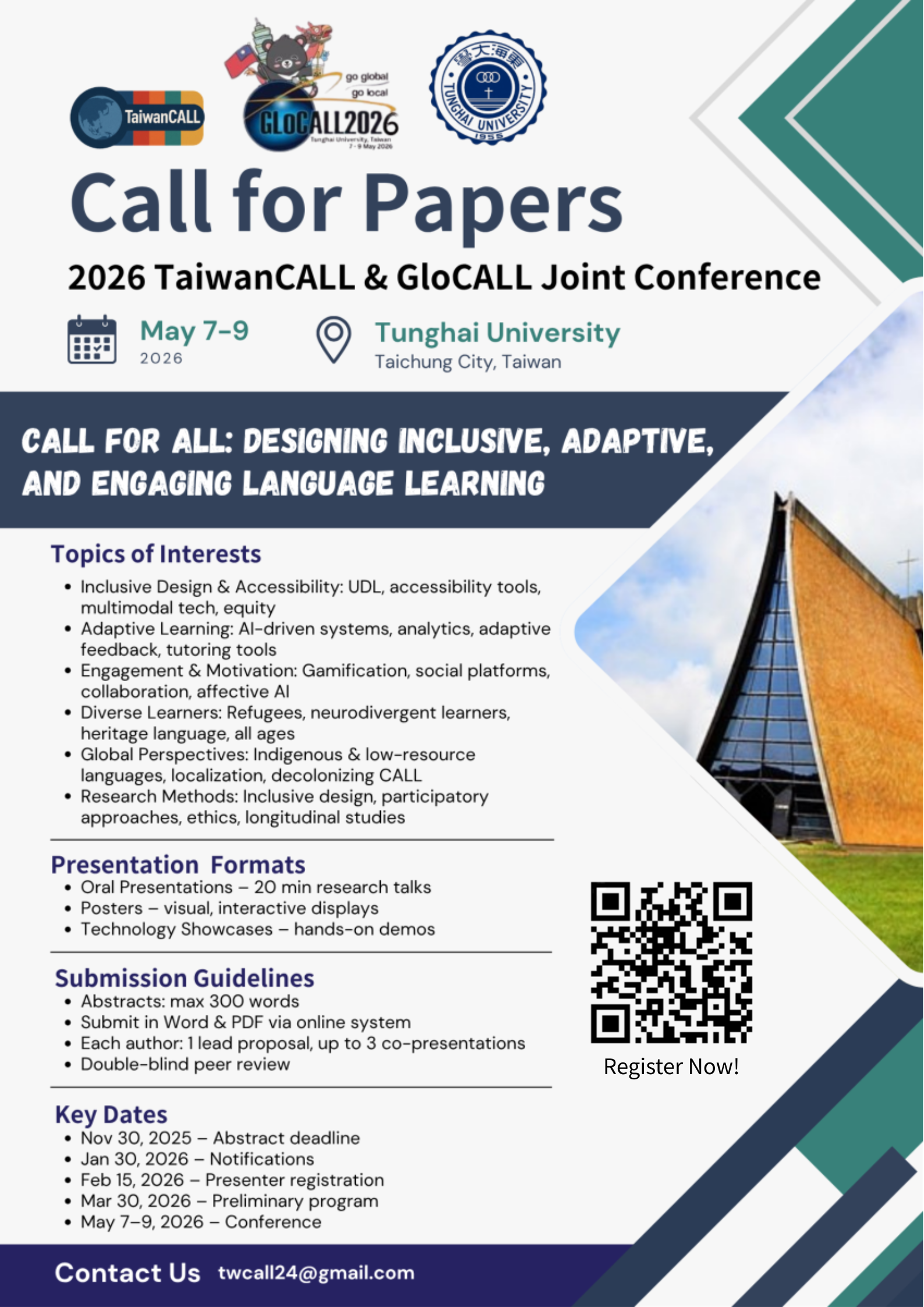 主旨:檢送本校外國語文學系辦理「2026臺灣電腦輔助語言學習學會暨全球電腦輔助語言學習國際研討會」徵稿啟事,敬請貴校惠予協助公告並轉知所屬師生踴躍賜稿為荷。