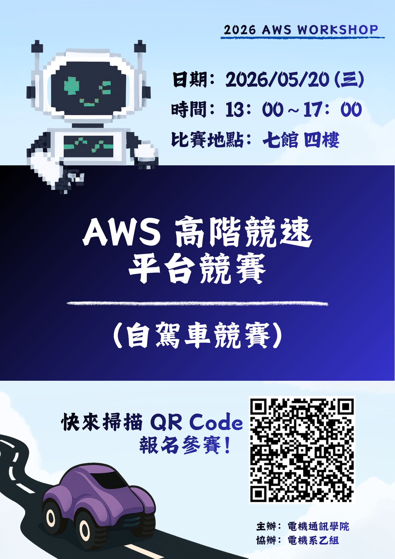 - 本次自駕車競賽無須至AWS Academy註冊帳號,自駕車模型設定、訓練等過程,皆由參賽同學自主學習完成。主辦單位將安排賽前練習時段給予參賽者實作演練,相關事宜將以報名email聯繫通知。