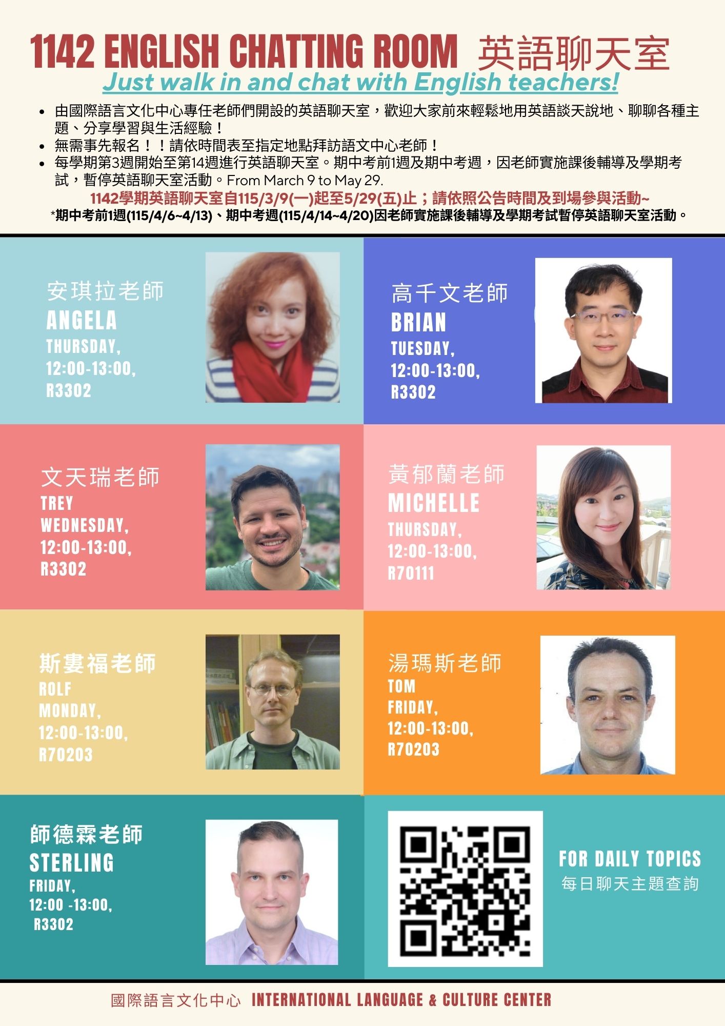 - 115年3月9日(一)起至115年5月29日(五)止,請依時間表至指定地點和語文中心老師聊天!(無需事先報名)