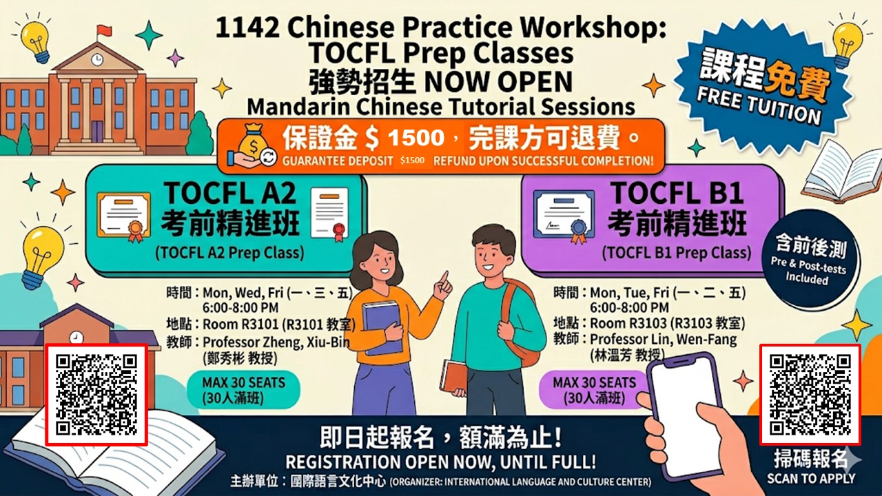 Are you ready to pass the TOCFL exam? Registration for the "1142 TOCFL Prep Classes," organized by the International Language and Culture Center, is now open! These sessions are strictly designed to boost your test-taking skills. Seats are limited, so sign up today!