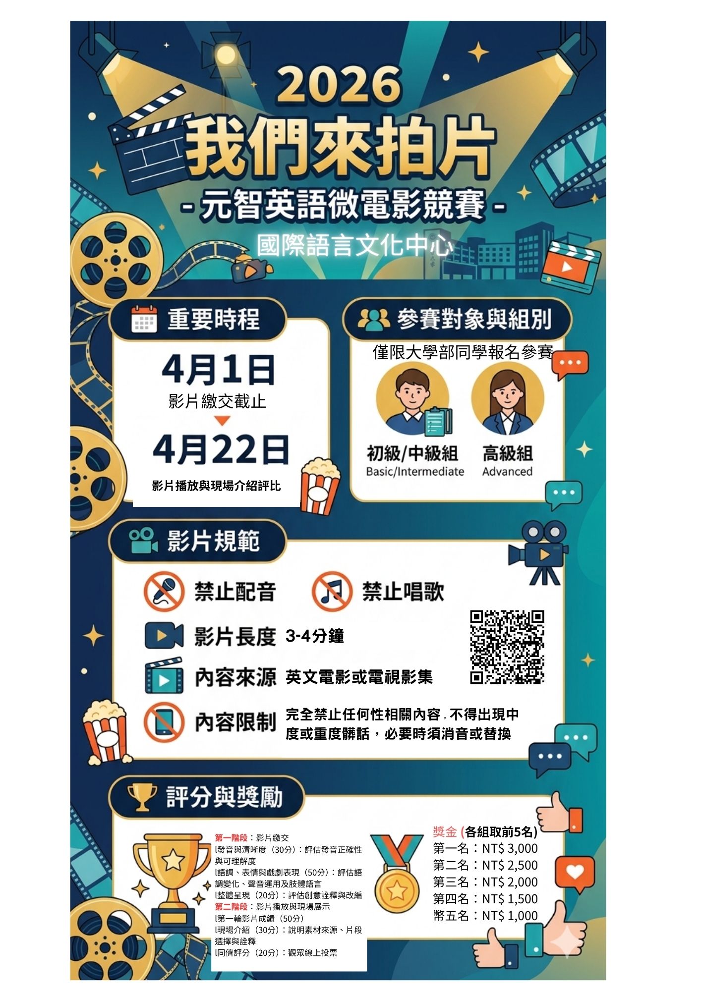 - 參賽資格:全校大學部學生,每隊 1–4 人(每位成員皆須有台詞) 。