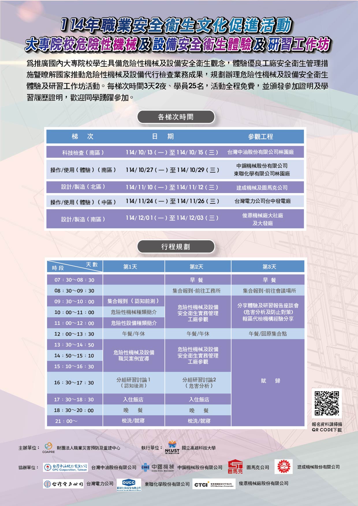 第114IW06526號校承辦財團法人職業災害預防及重建中心主辦之「114年職業安全衛生文化促進活動-大專院校危險性機械及設備安全衛生體驗及研習工作坊」,每梯次營隊期程三天兩夜,全程免費。敬請鼓勵貴校機械工程、電機工程、職業安全衛生、消防、土木工程、營建工程、建築工程等相關科系及研究所學生參加,並協助安排學生請假事宜,請查照。