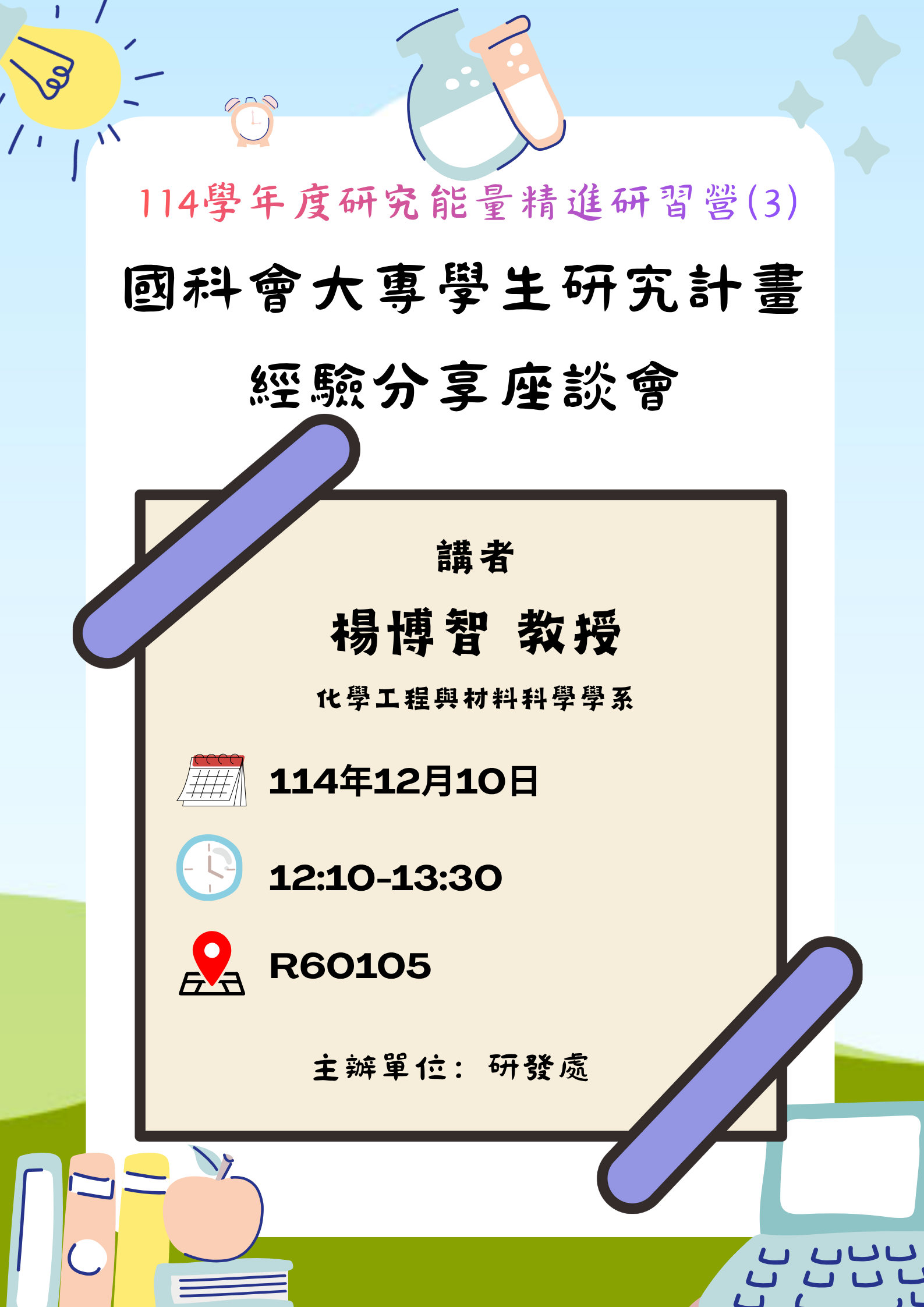 研發處特別邀請化材系楊博智教授及本年度執行大專生計畫同學分享執行研究計畫優勢、撰寫計畫書訣竅及審查委員的審查角度。