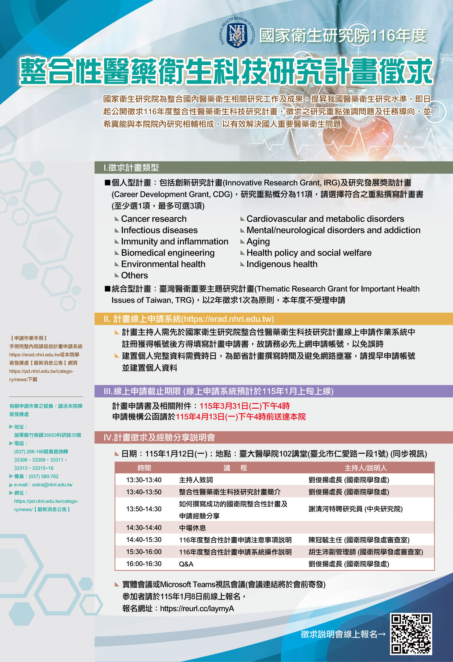 - 本院將於115年1月12日(星期一)下午1時30分,假國立臺灣大學醫學院102講堂舉辦「計畫徵求及經驗分享說明會」(同步視訊),議程及報名網址詳如計畫徵求海報,報名截止日期為115年1月8日(星期四)。