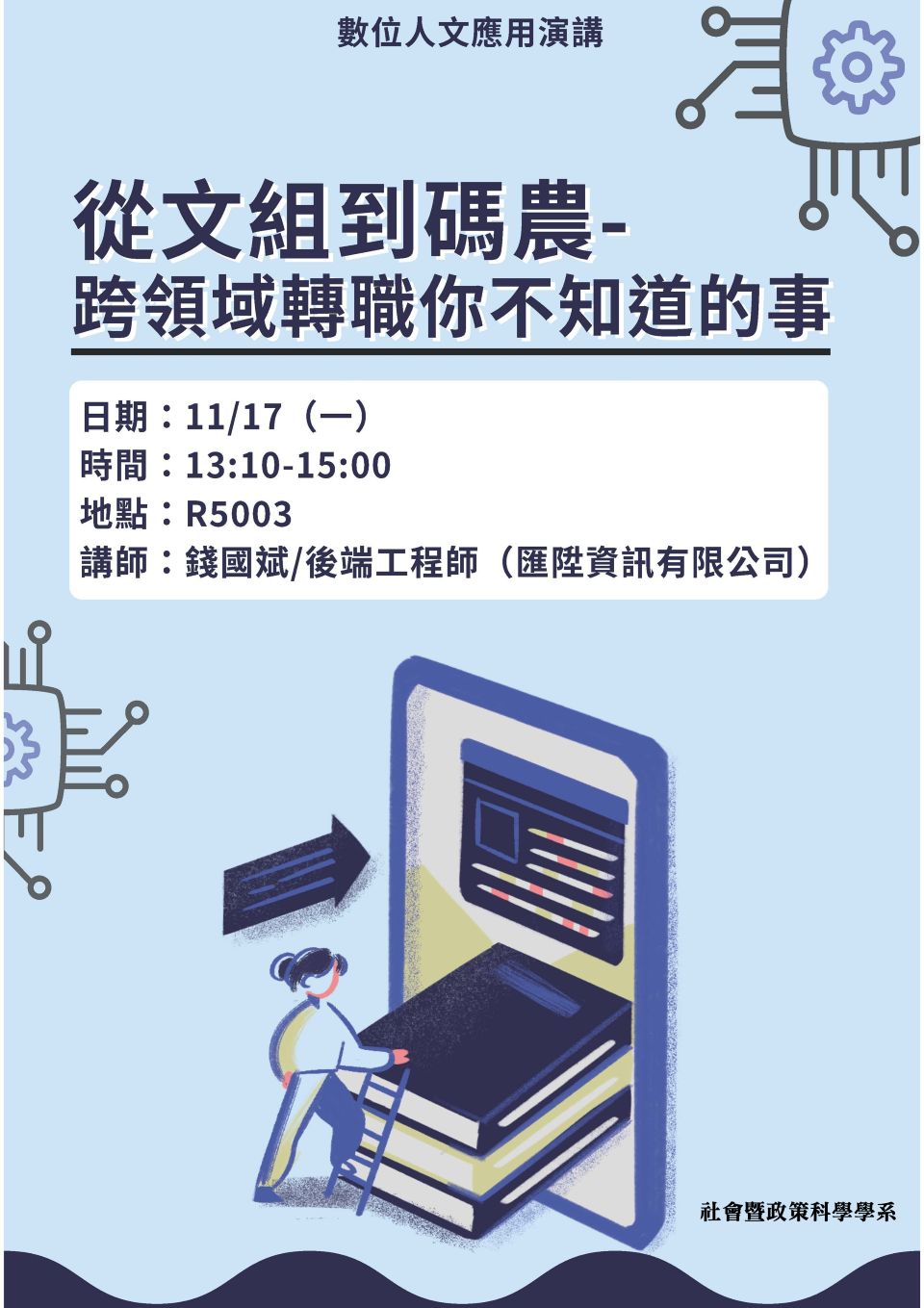 社政系課堂演講「從文組到碼農--跨領域轉職你不知道的事」114/11/17(一)13:10-15:00~R5003教室