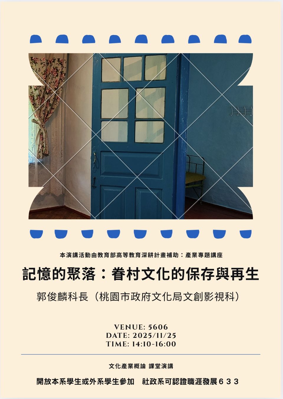 社政系課堂演講「記憶的聚落:眷村文化的存與再生」114/11/25(二)14:10-16:00~R5606教室