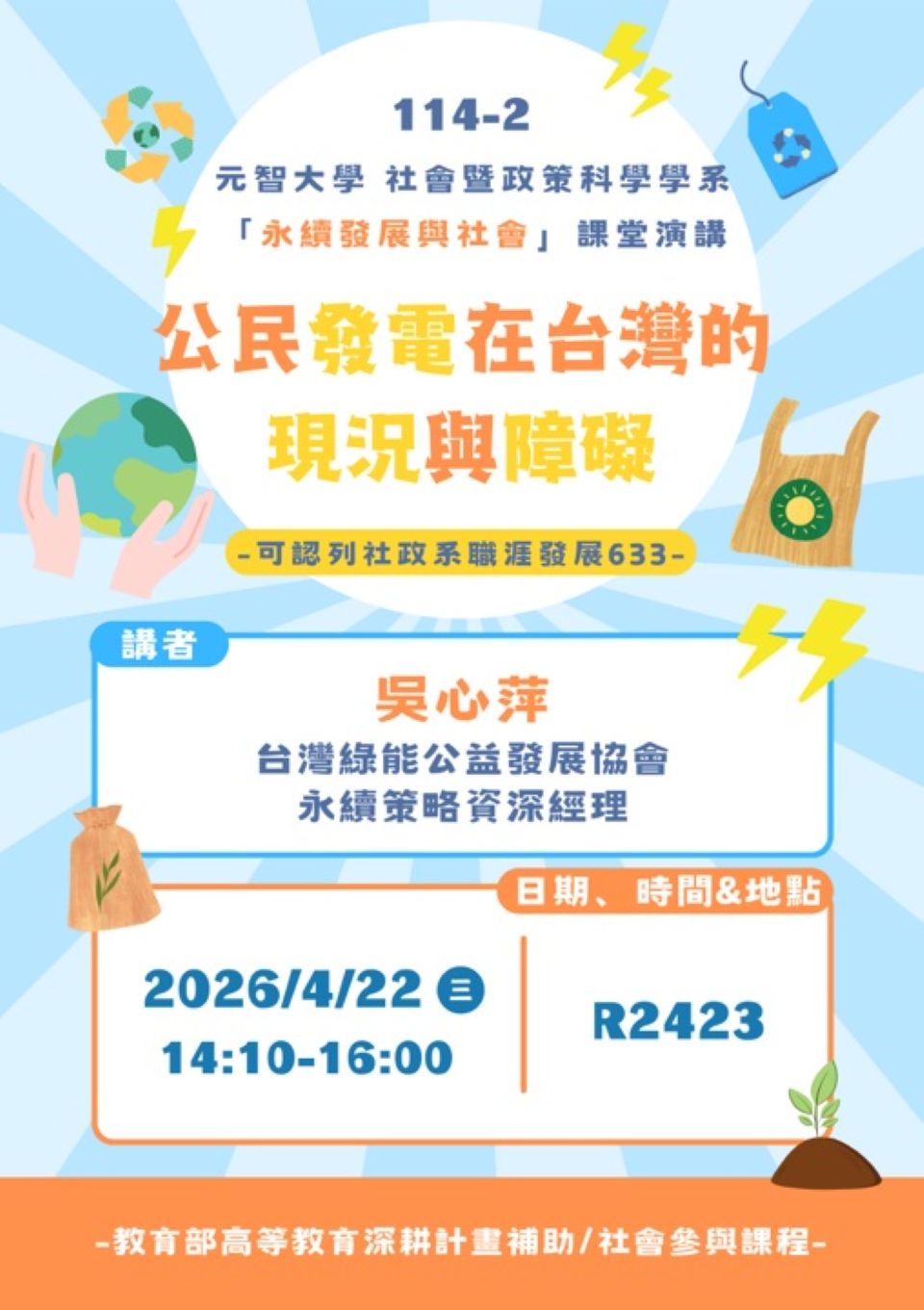 社政系課堂演講「公民發電在台灣的現況與障礙」115/04/22(三)14:10-16:00~R2423教室