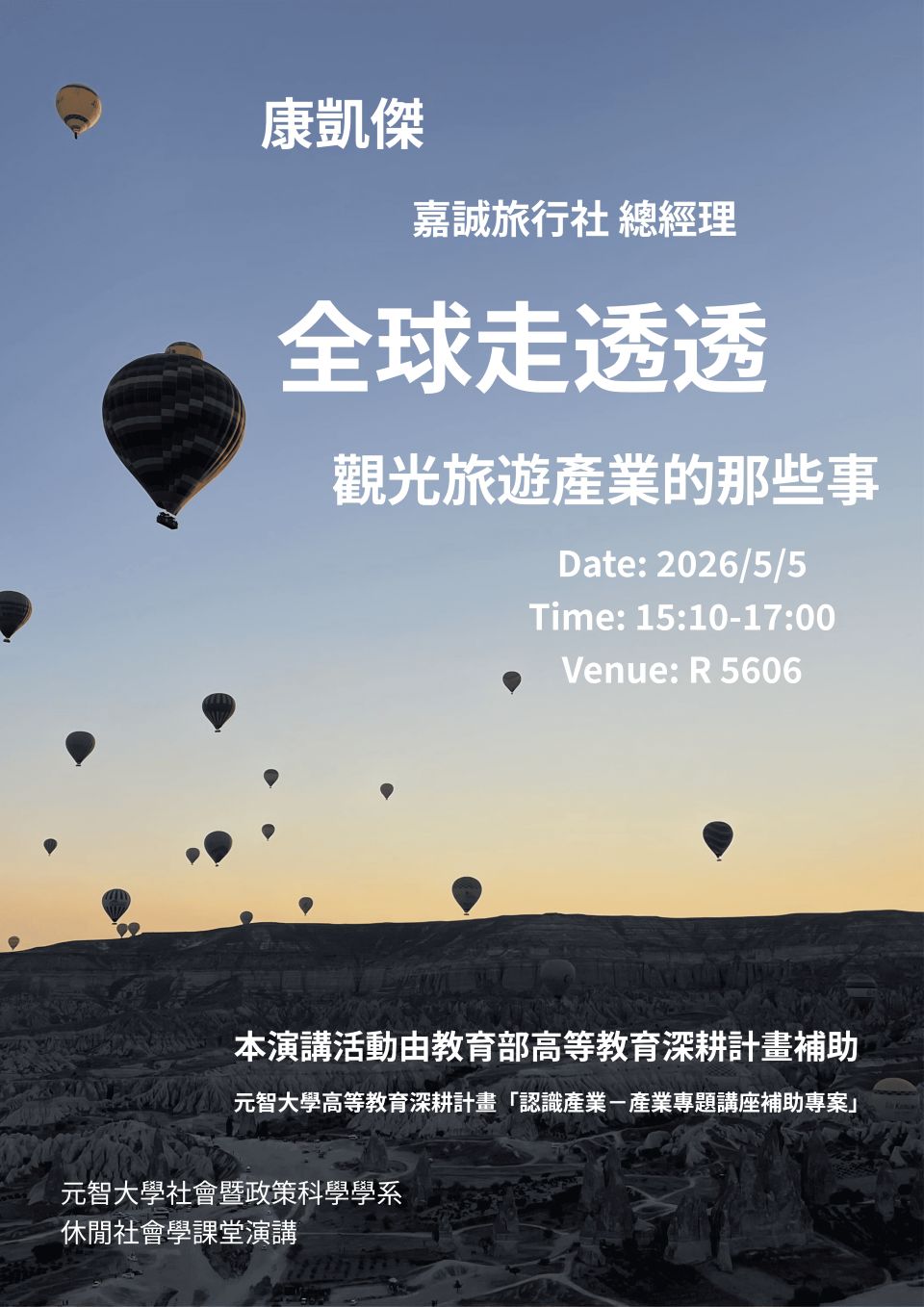社政系課堂演講「全球走透透-觀光旅遊產業的那些事」。115/05/05(二)15:10-17:00~R5606教室。