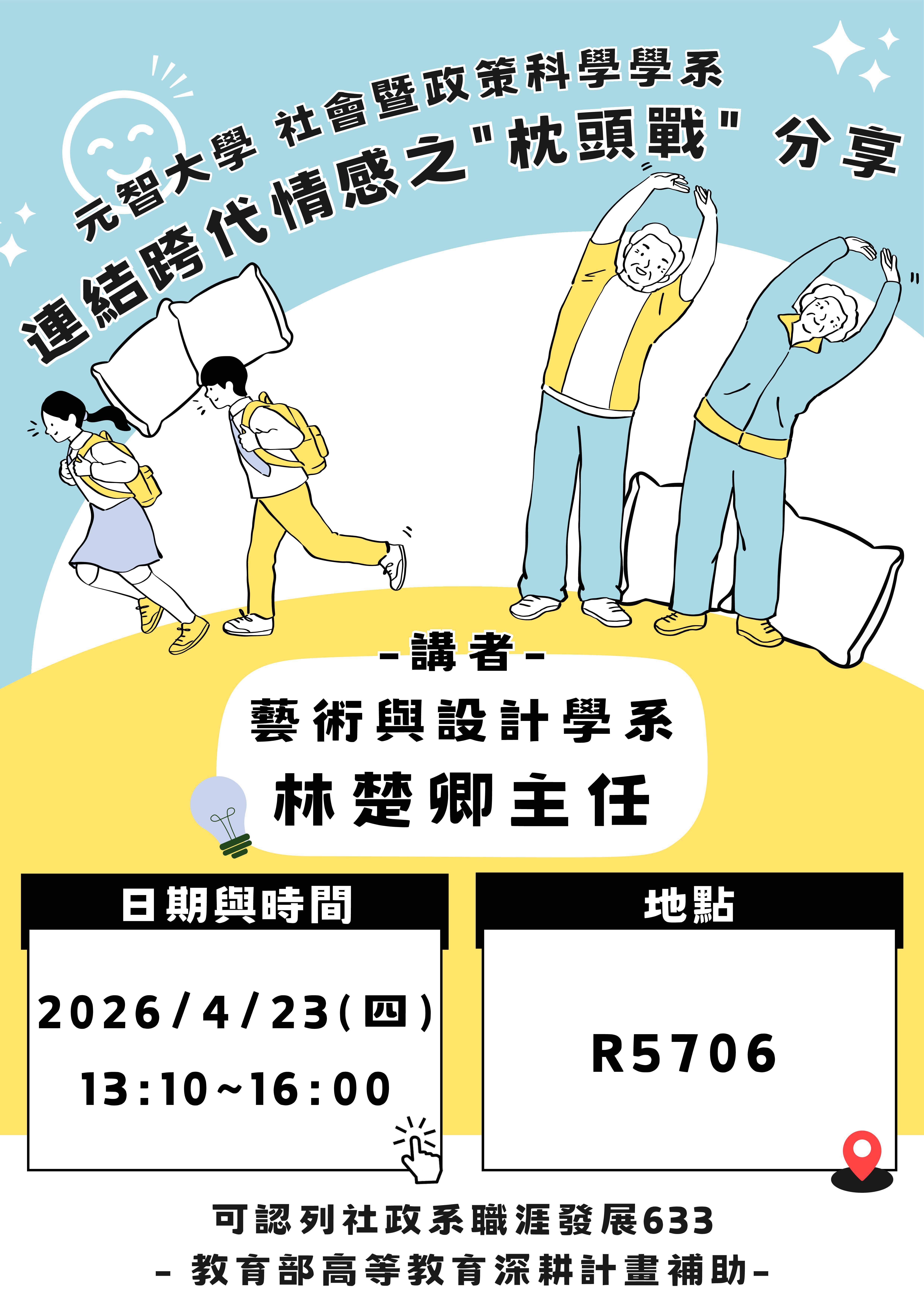社政系課堂演講「連結跨代情感之"枕頭戰"分享」115/4/23(四)13:10-16:00~ R5706 教室
