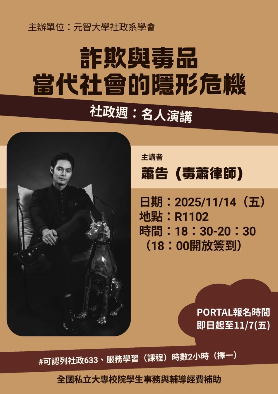 2025社政週名人演講「詐欺與毒品--當代社會的隱形危機」114/11/14(五)18:30-20:30敬請踴躍報名