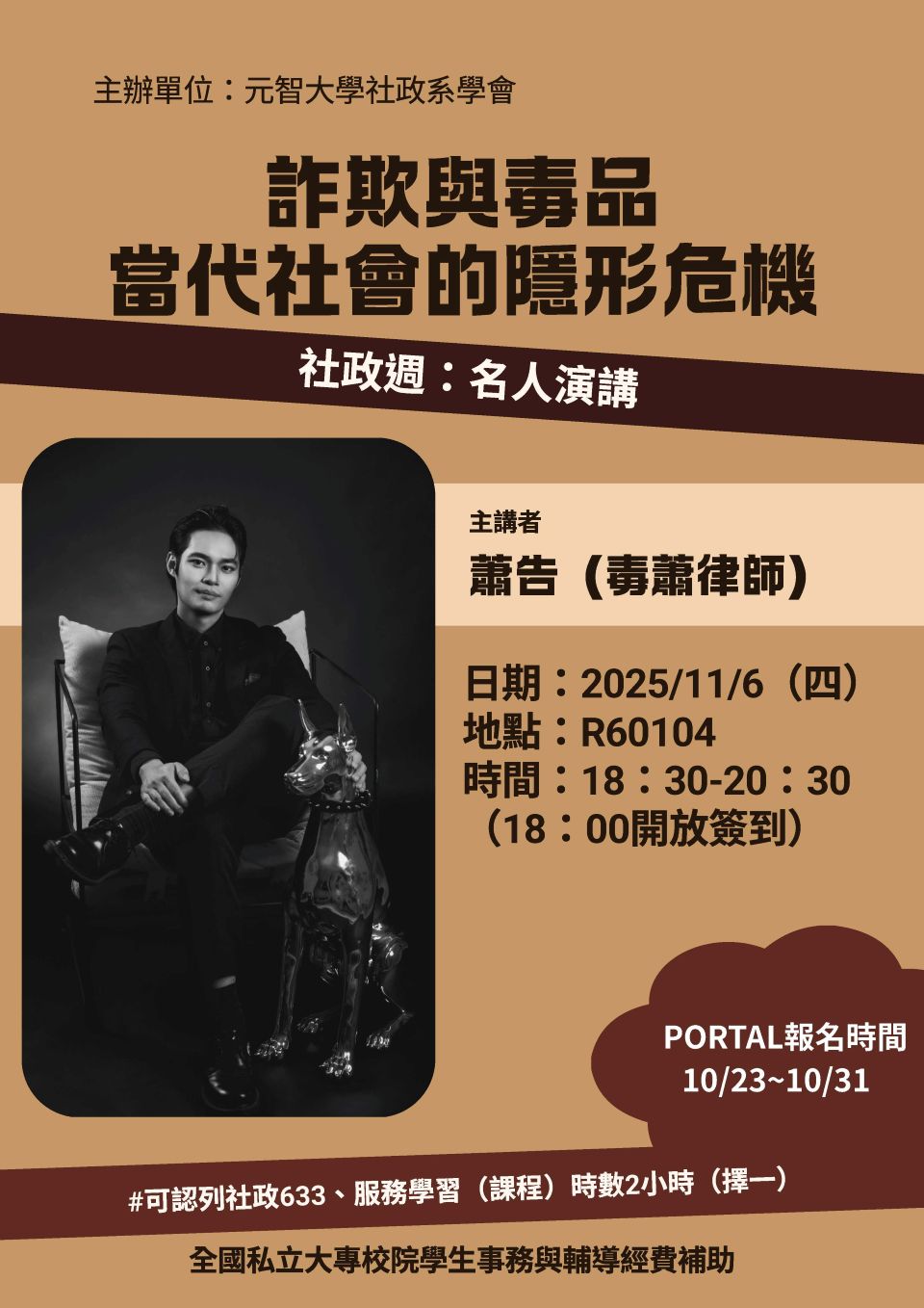 2025社政週_名人演講活動114/11/6(四)18:30-20:30可認列服務學習課程時數2小時、社政系職涯發展633(二擇一),敬請踴躍報名~