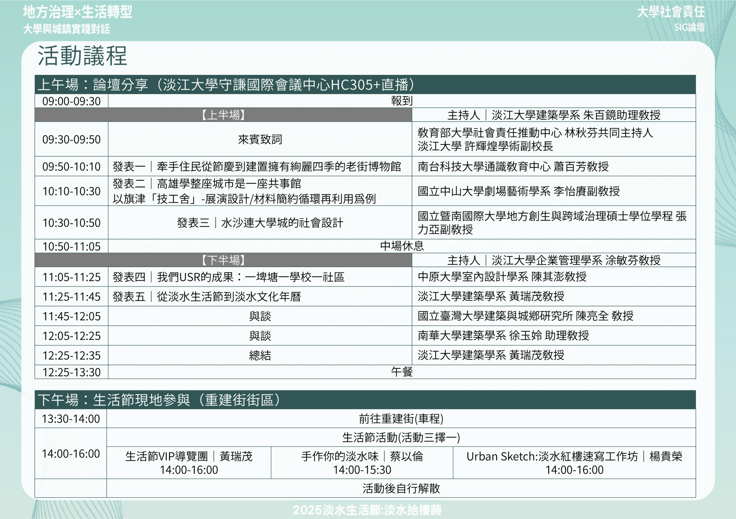 SIG研討會選在淡江大學所在的淡水小鎮,也邀請大家參與「2025年淡水生活節:淡味拾棲蒔」的地方節慶活動。這個從「好生活計畫」期末課程合展,以及疫情期間地方與大學合作深化所逐漸發展起來的地方盛事,已來到第三年。節慶活動動員了市街人事物共學共創,透過與地方生活的接近,邀請新住民重回老街與農村盡享這一片美好。敬邀參與SIG的夥伴可以順著鑼鼓聲再遊小鎮。