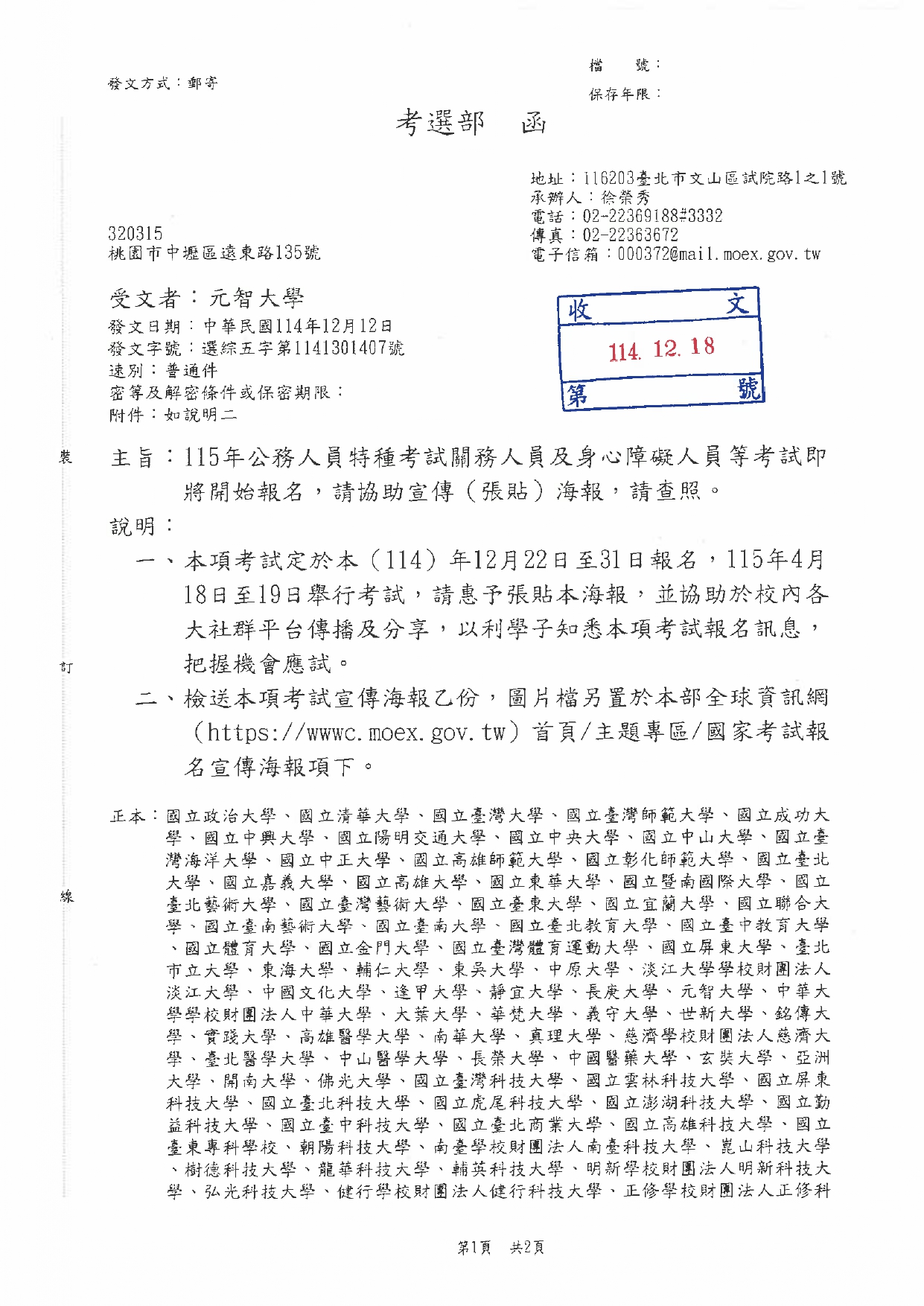 報名時間訂於114年12月22日至31日、考試時間115年4月18日至19日,協請學校協助宣傳。