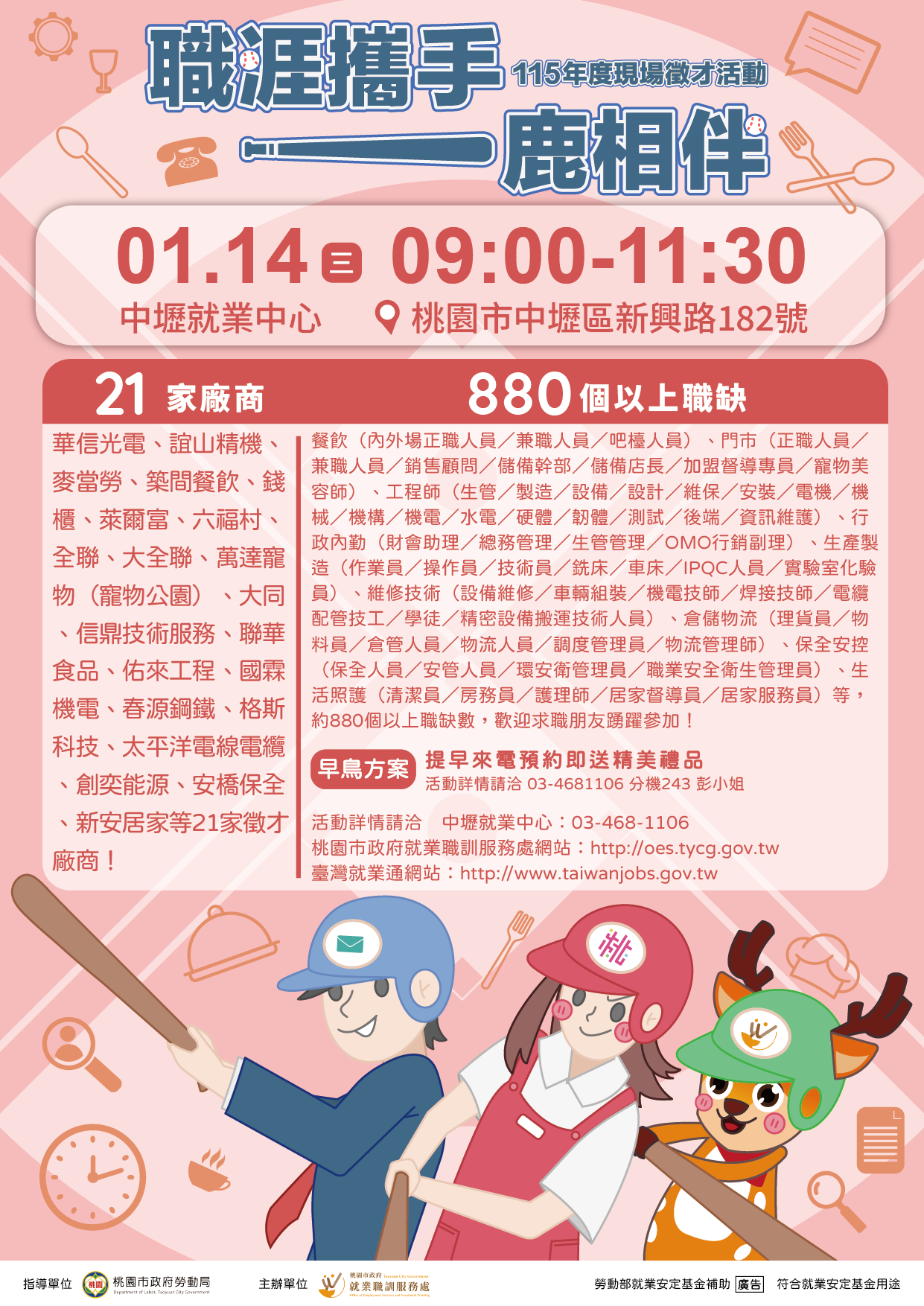 【諮就組公告】轉知 中壢就業中心訂於115年1月14日(星期三)9時至11時30分辦理現場徵才活動