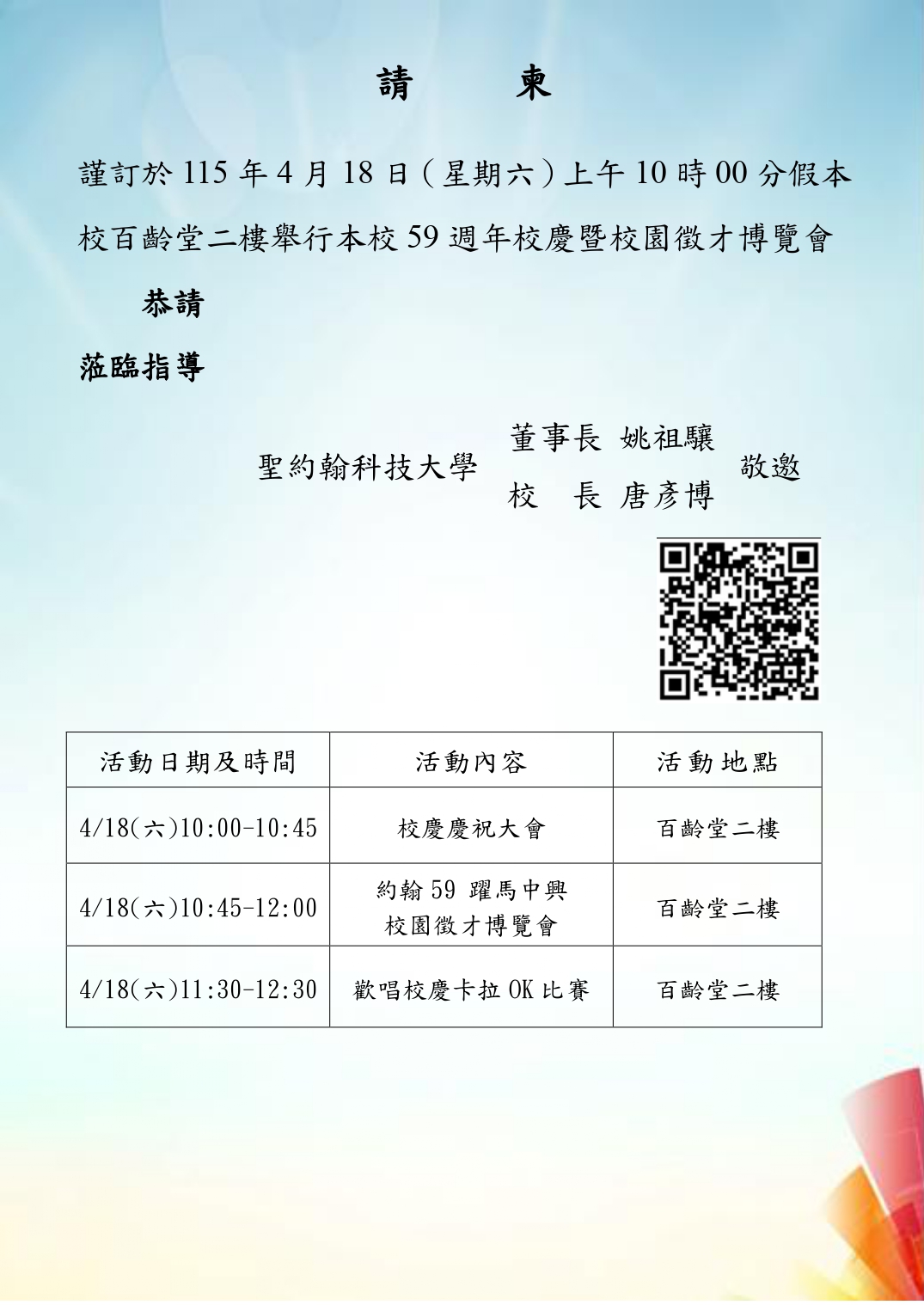 謹訂於 115 年 4 月 18 日(星期六)上午 10 時 00 分假本校百齡堂二樓舉行本校 59 週年校慶暨校園徵才博覽會