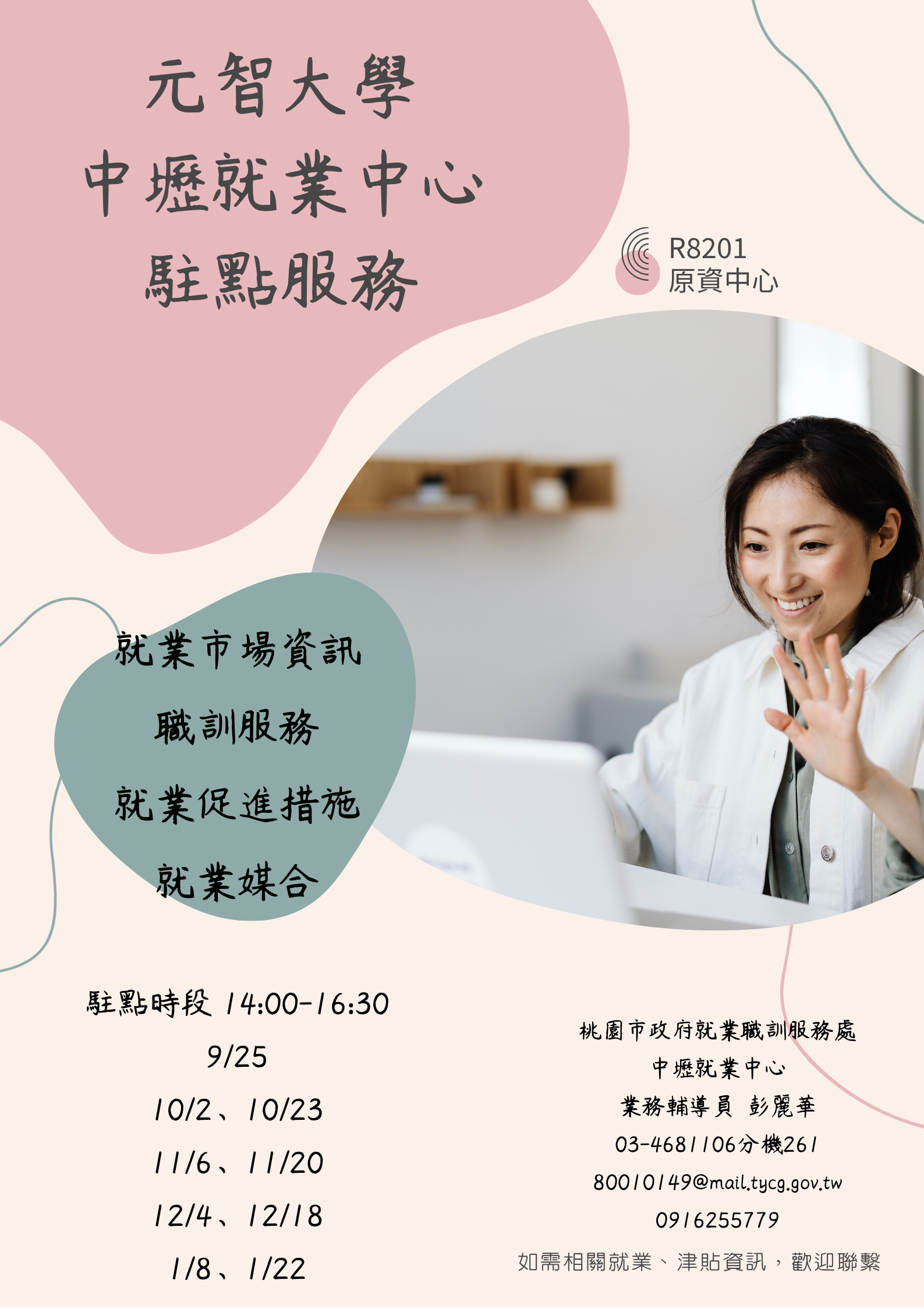 桃園市政府就業職訓服務處中壢就業中心10月起進駐我校,提供就業市場資訊、職訓服務、就業促進措施及就業媒合等相關服務。提供學生就業市場、職訓及就業促進措施等資訊,並進行就業媒合服務 駐點時段:10月起,每月2次