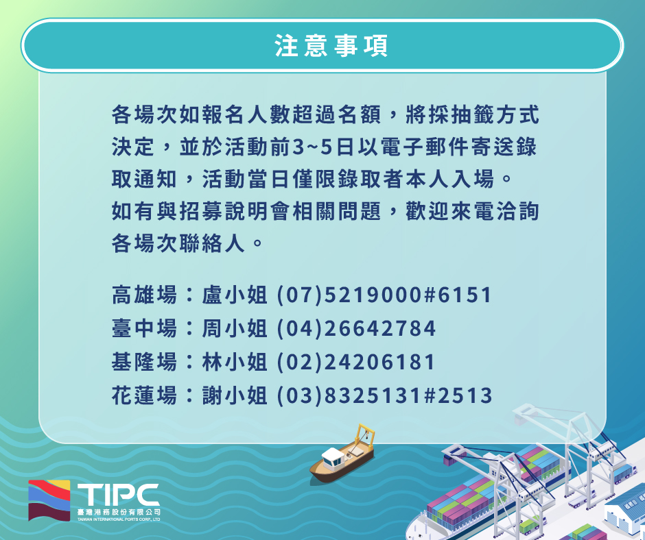 (一)高雄場: 1、活動日期:114年12月20日(星期六),報名期限至同 年月10日(星期三)。 2、活動地點:高雄港旅運中心1樓(高雄市海邊路5 號)。 3、名額:100名。