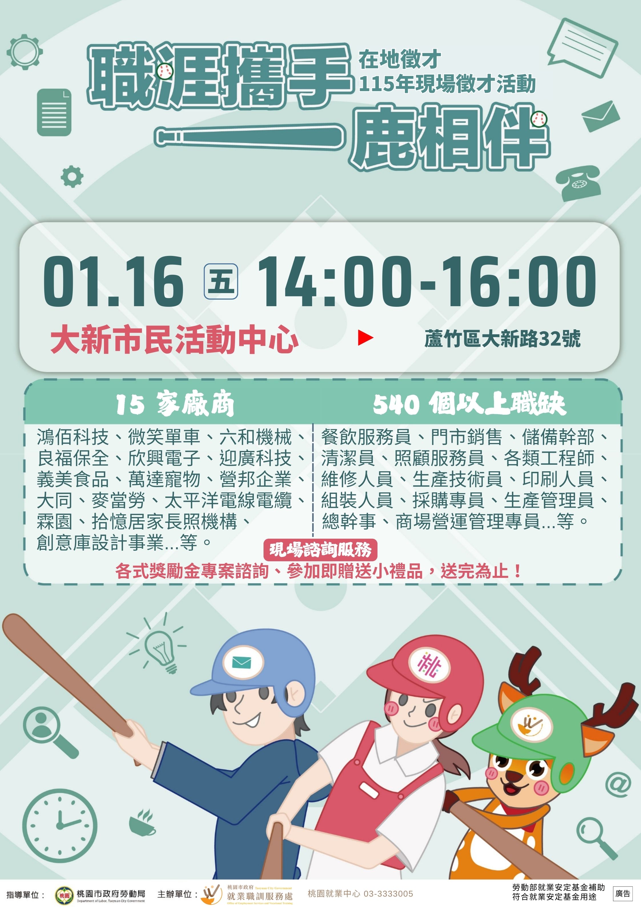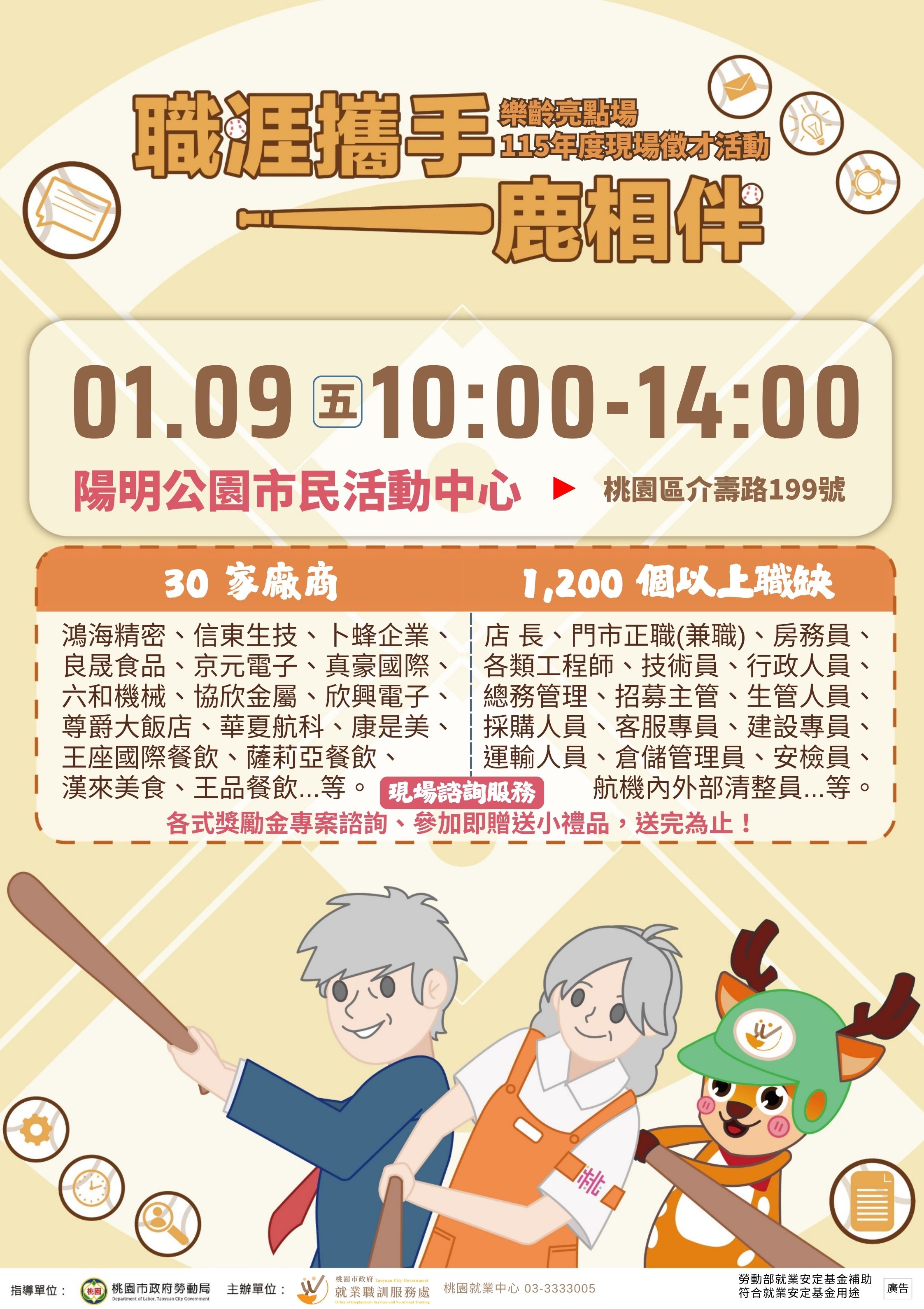 桃園就業中心將舉辦 「職涯攜手 一鹿相伴」徵才活動為提供本市待業民眾及事業單位求職求才服務,桃園就業中心將辦理揭活動,活動日期及地點如下: