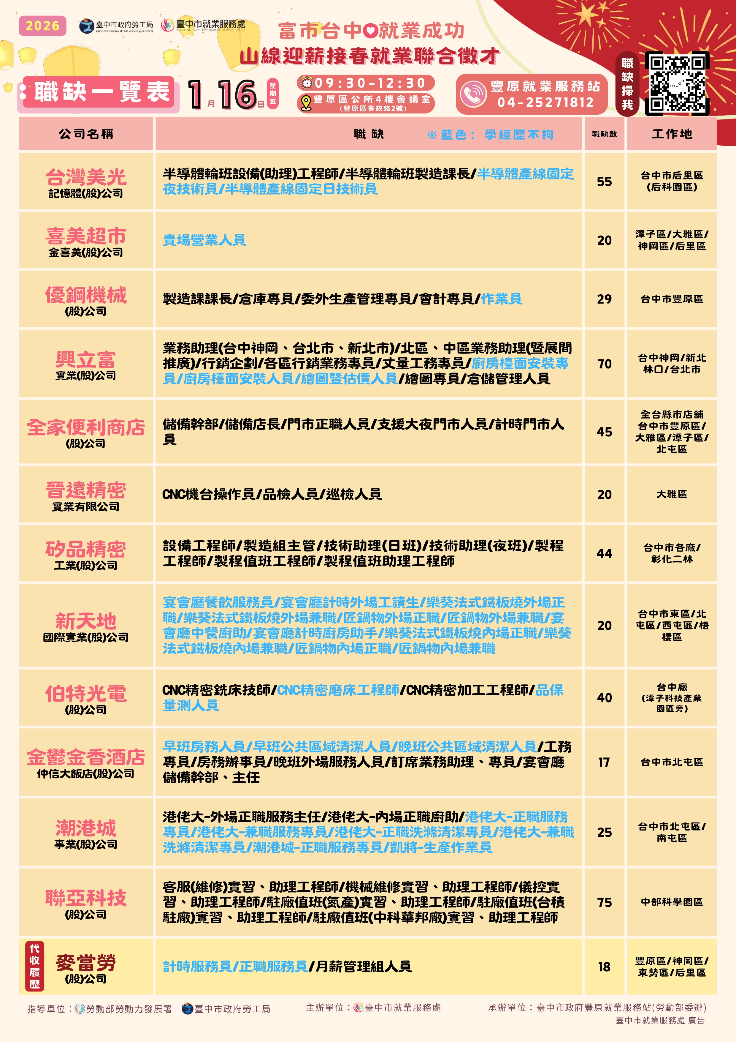 「好職、好機會,山 線新年一次全網羅!臺中市就業服務處將於1月16日(星 期五)上午9時30分至12時30分,在豐原區公所4樓會議室辦理聯合徵才,邀請台灣美光、聯亞科技、全家便利商店及新天地等共13家,提供超過450個職缺,歡迎把握機會踴躍參加,活動詳情請至臺中市就業服務處官網查詢 。