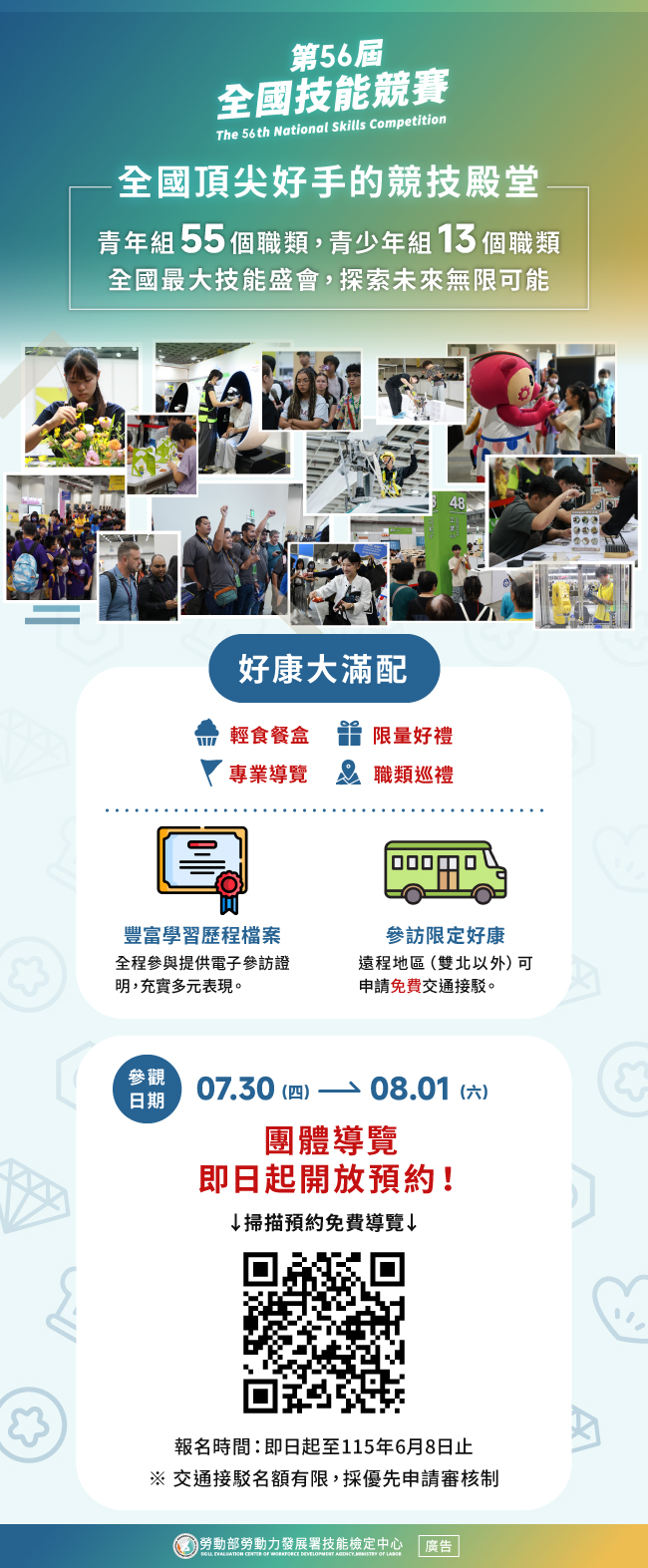 旨揭競賽活動訂於115年7月29日(星期三)至8月2日(星期日)假台北南港展覽館1、2館(臺北市南港區經貿二路1、2號)舉辦,本次辦理青年組55職類與青少年組13職類,共計68職類,為職業訓練與技職教育之年度盛事。旨揭競賽活動之競賽日程(7月30日至8月1日)歡迎各級學校師生踴躍參訪,安排學生戶外教學,師生一同蒞臨參觀,現場提供免費導覽(含外語)服務(申請網址:https://reurl.cc/jmj56p)、交通接駁及活動限量宣導品,期能強化技能教育、提升學習意識,以達到向下紮根之目的,並強化國際連結。承上,免費交通接送與導覽服務之申請截止日期為115年6月8日(星期一),如有任何問題,請洽本活動受託單位:台北市電腦商業同業公會許小姐,電話:(02)25774249分機853 ,電子郵件: