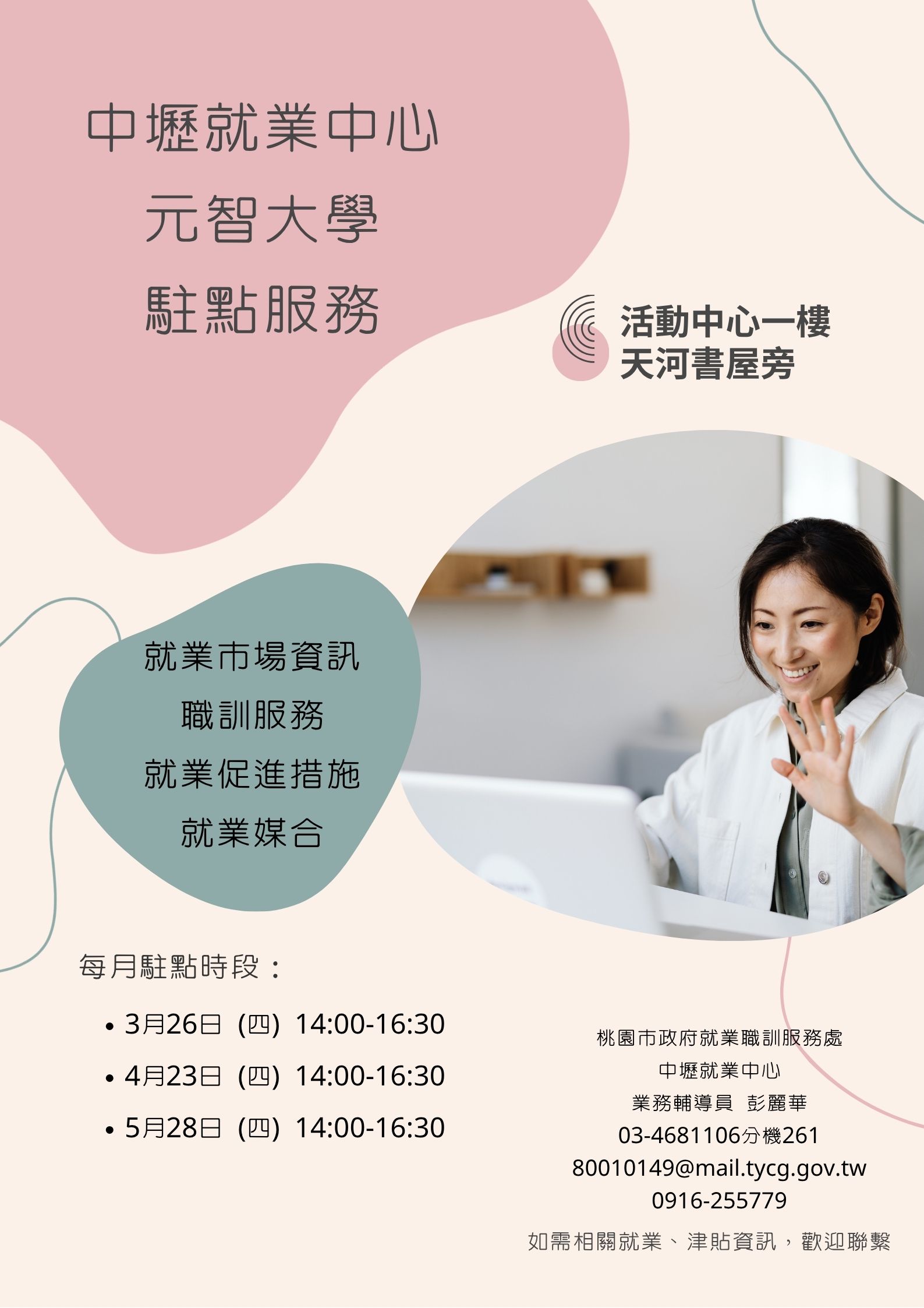 【諮就組公告】中壢就業中心 本週四 1400-1630 駐點服務 @天河書屋旁 提供就業促進措施、就業媒合、津貼諮詢